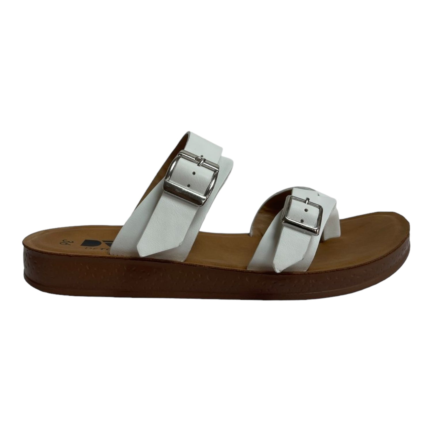 La sandalia Detogni modelo Soledad en color blanco combina frescura y practicidad. Con suela liviana de 3 cm y plantilla acolchada, entrega confort en cada paso. Su diseño con dos correas anchas con hebillas metálicas ajustables y detalle tipo dedo ofrece un look clásico y versátil, ideal para acompañar tus outfits casuales de verano.