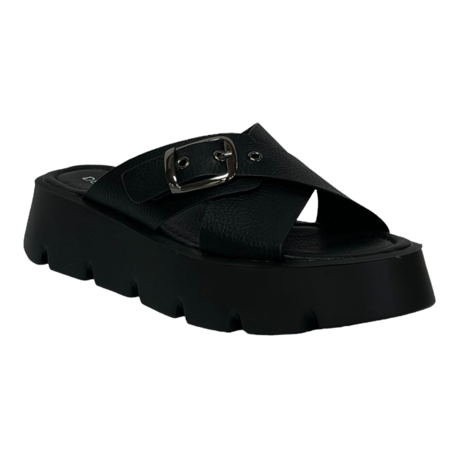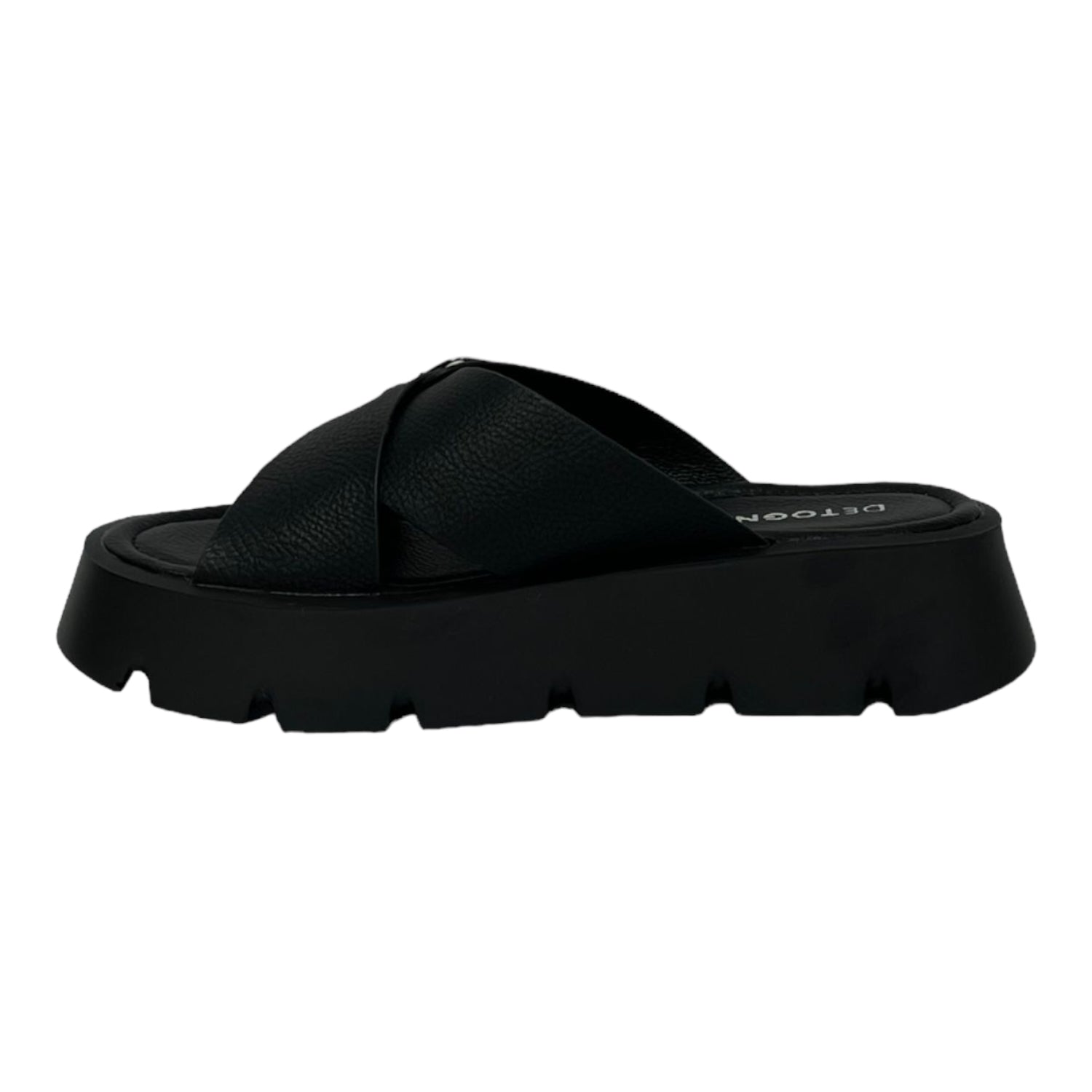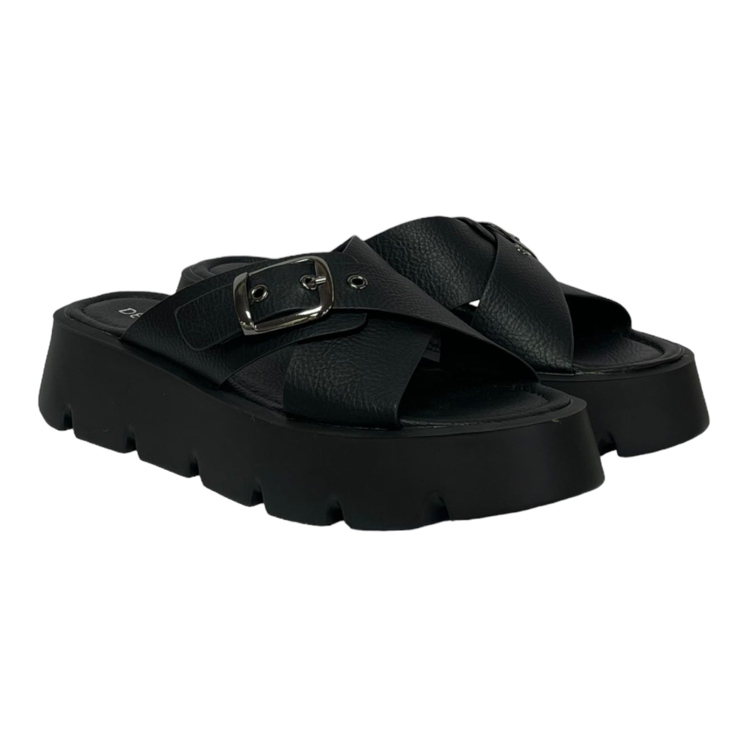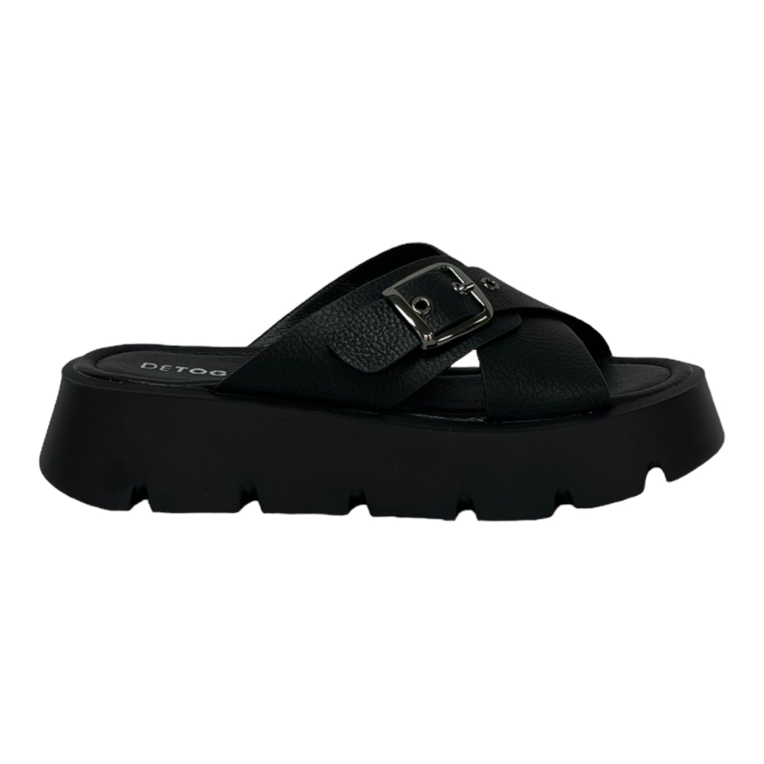 La sandalia cómoda Detogni modelo Balos en color negro combina practicidad y estilo urbano. Con plataforma de 5 cm y suela dentada, brinda estabilidad y seguridad al caminar. Su diseño de correas cruzadas con hebilla metálica ajustable aporta un look moderno y versátil, ideal para acompañar outfits casuales con comodidad todo el día.