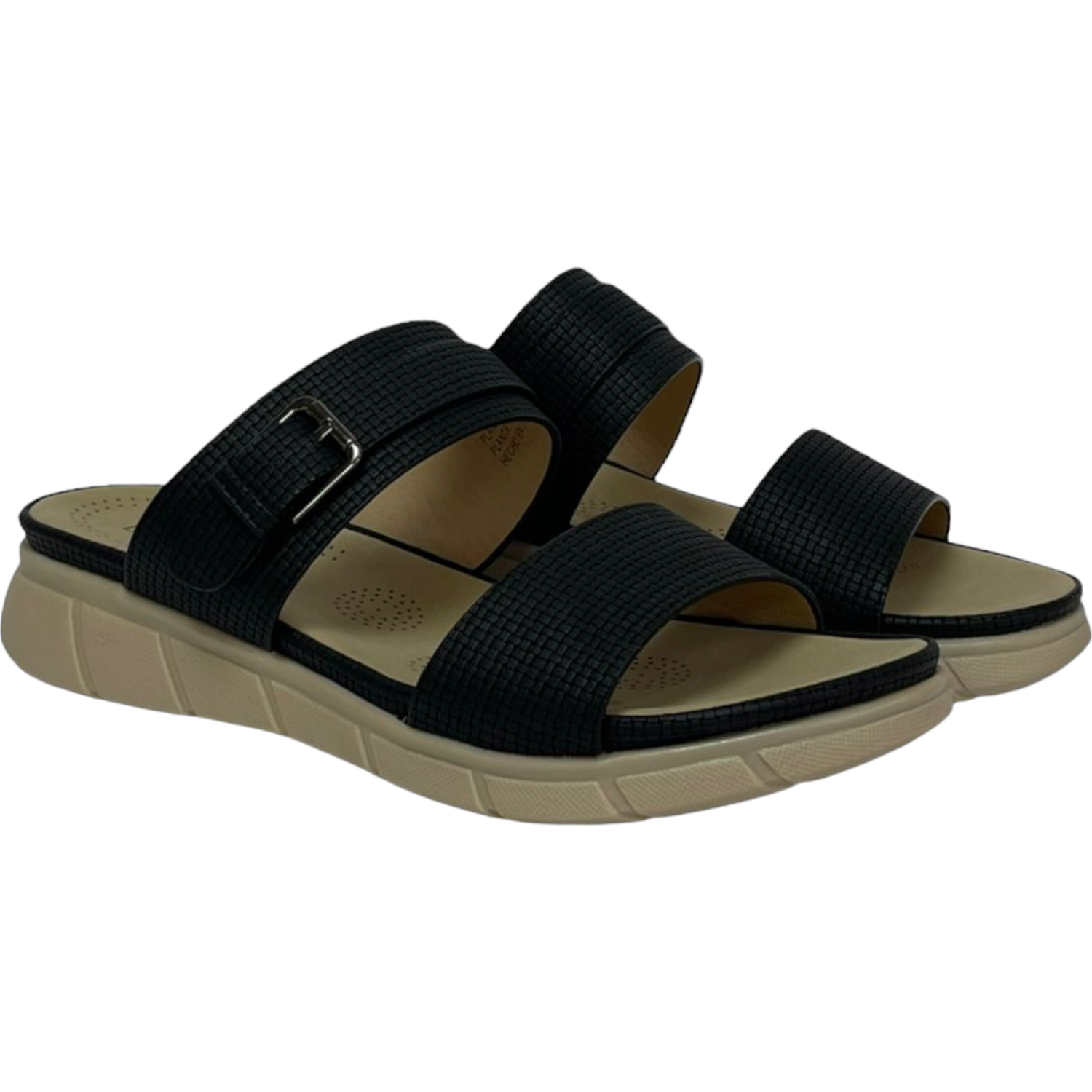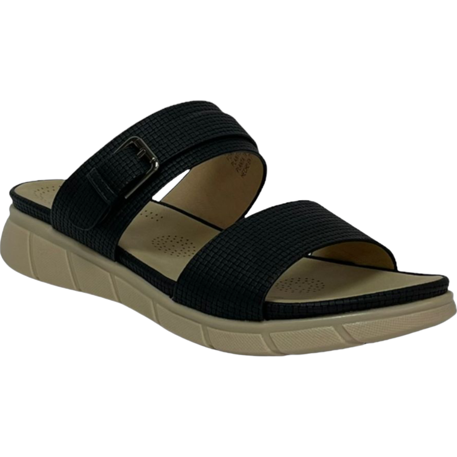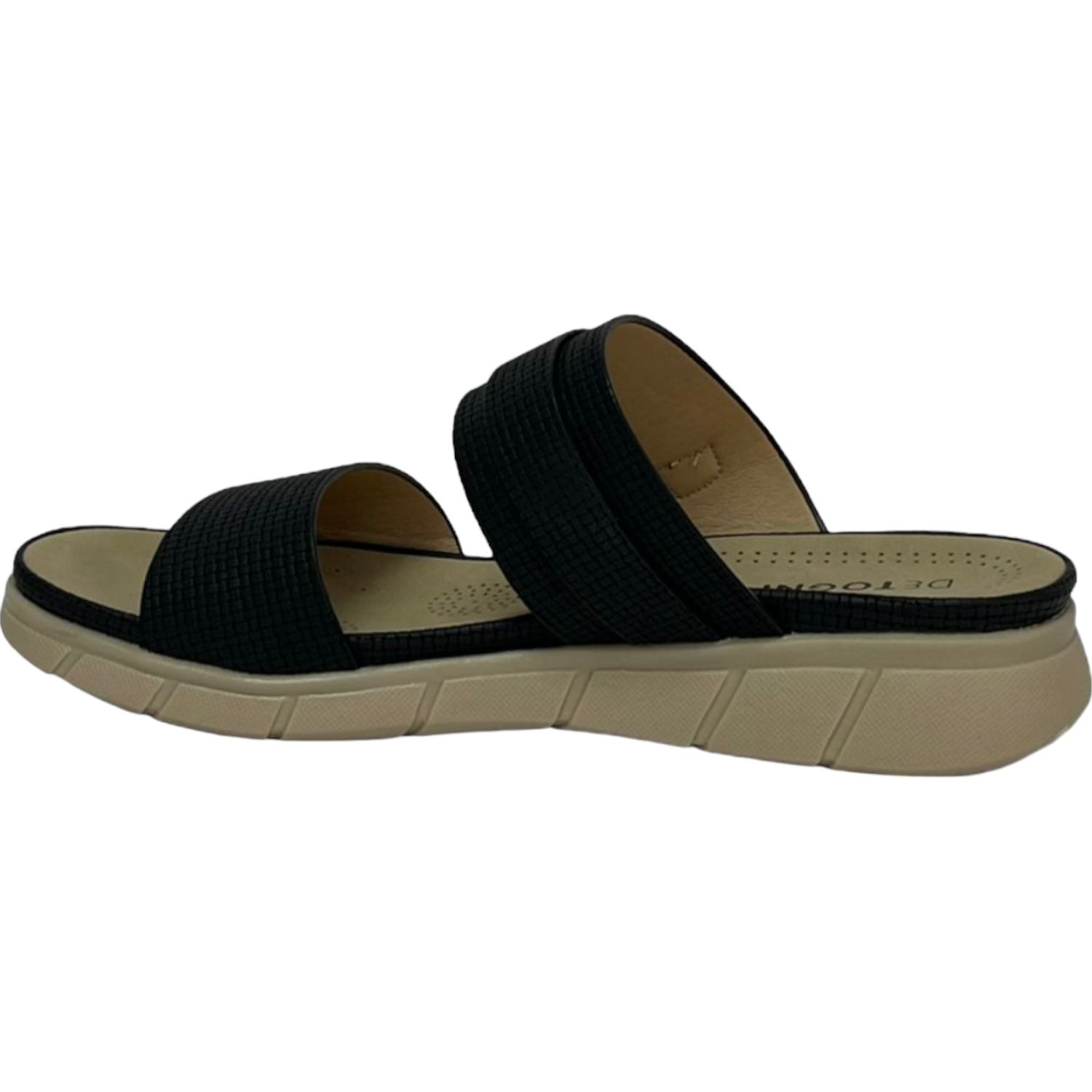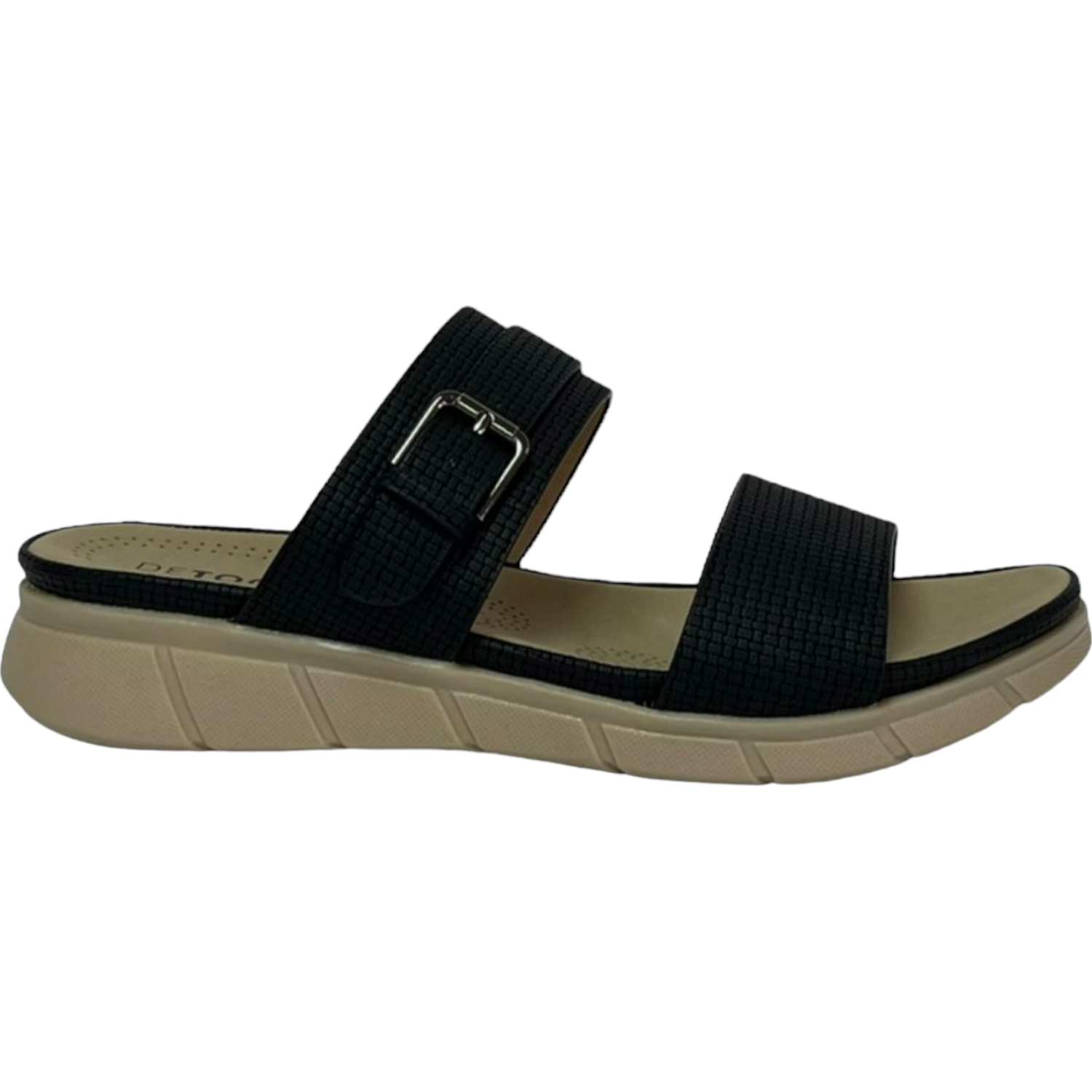 La sandalia cómoda Detogni modelo Gracia en color negro combina ligereza y estilo. Su diseño con doble correa, una de ellas ajustable con hebilla, ofrece practicidad y un calce seguro. La suela liviana aporta flexibilidad y confort, ideal para un look casual de uso diario.