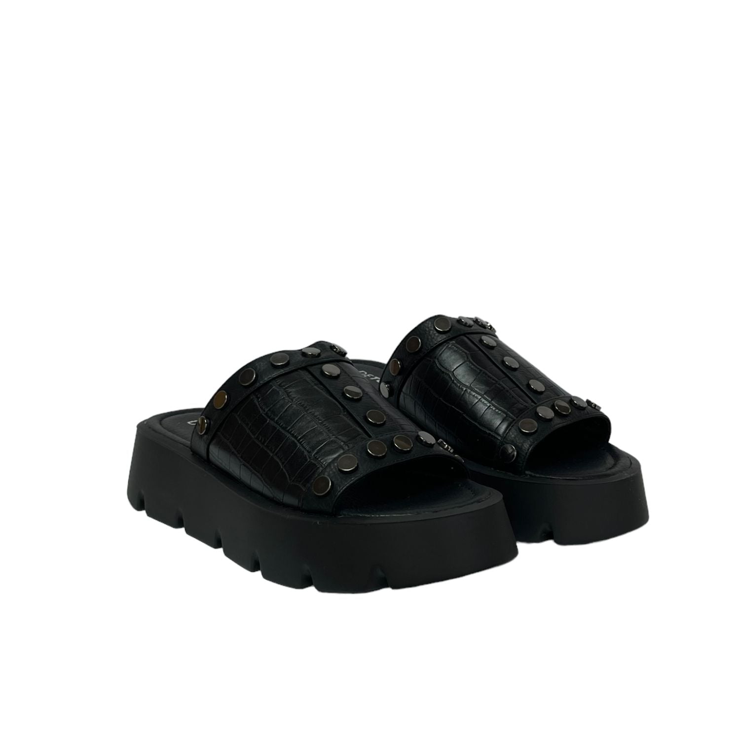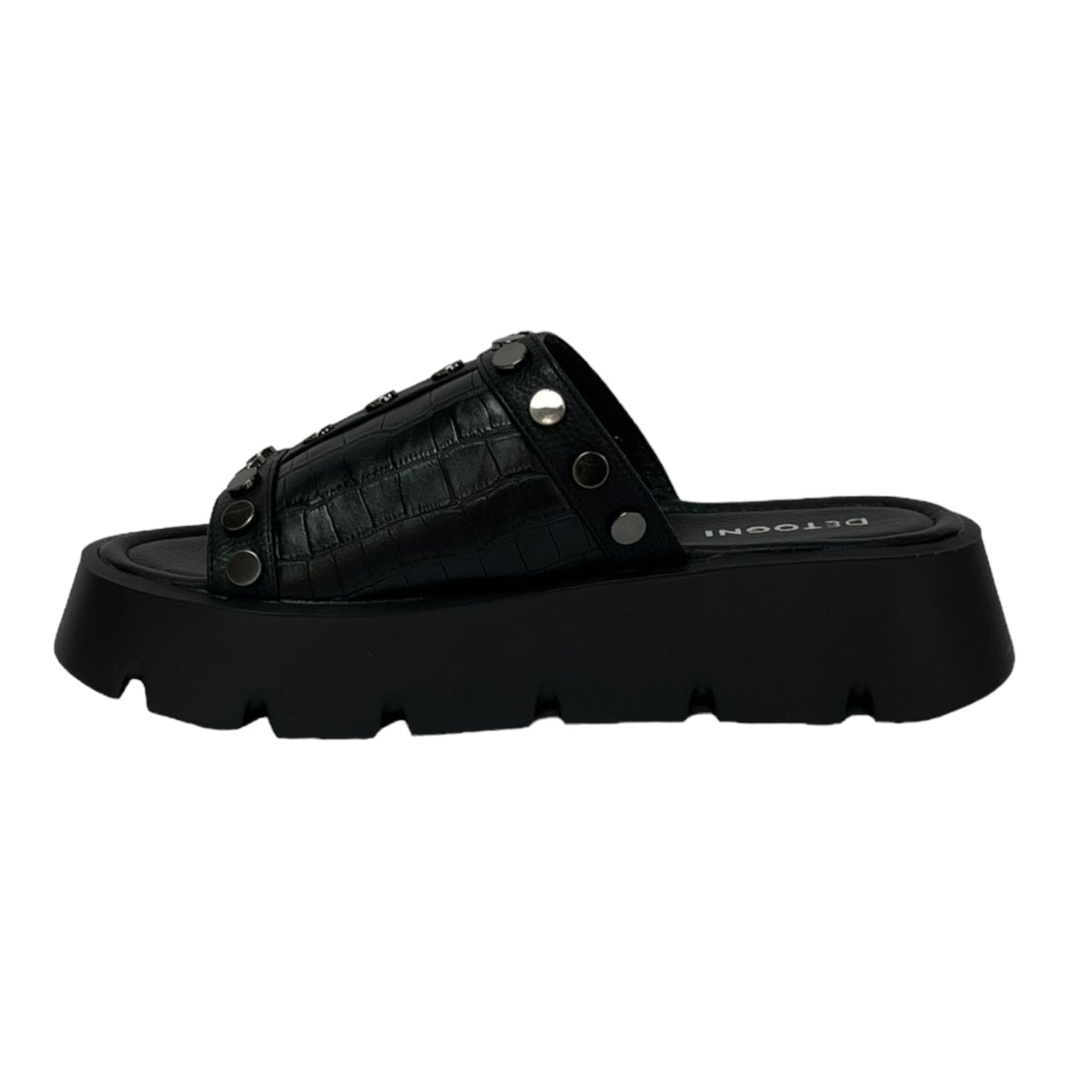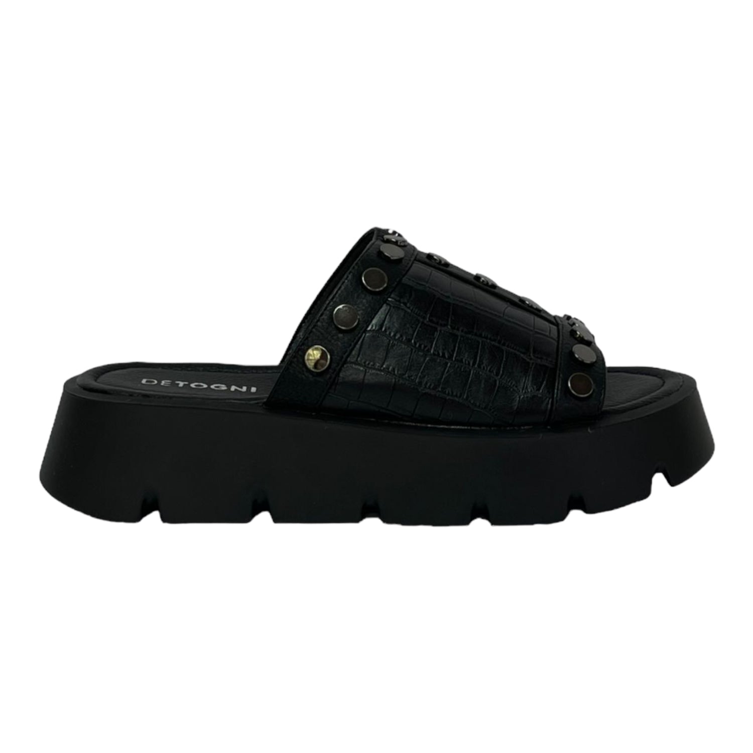 La sandalia cómoda Detogni Marina en color negro combina un diseño moderno y atrevido. Con plataforma de 5 cm y suela dentada, entrega firmeza y estilo urbano. Su capellada sintética con textura reptilada y detalles de tachas metálicas aporta un look audaz, mientras que la plantilla acolchada asegura comodidad en cada paso.