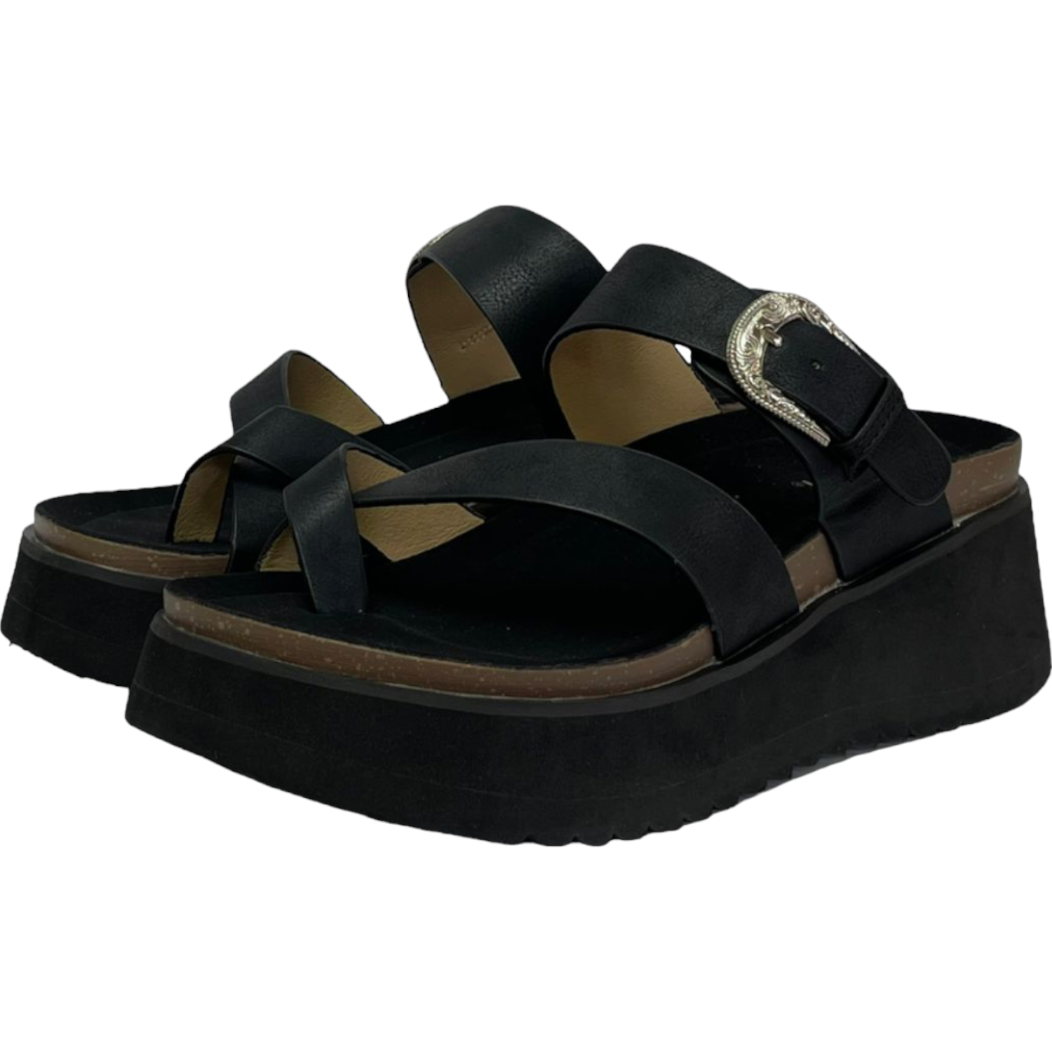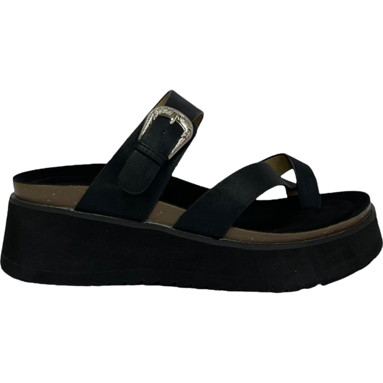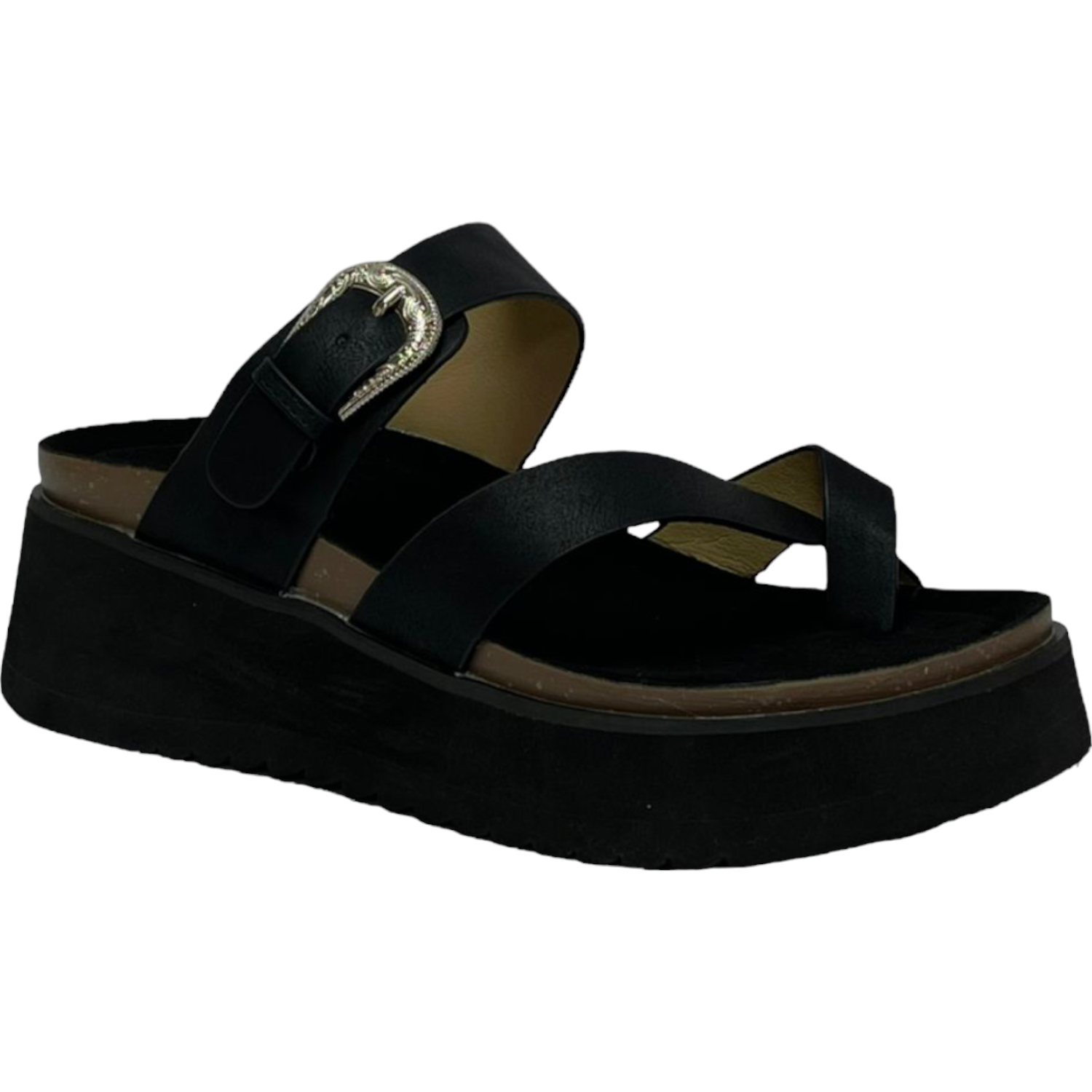 - La sandalia Rosario destaca por su estilo moderno y versátil. Con plataforma de 6 cm en EVA y plantilla textil, brinda suavidad y confort en cada paso. Su capellada sintética en color negro con hebilla la convierte en la opción ideal para un look casual con un toque elegante.