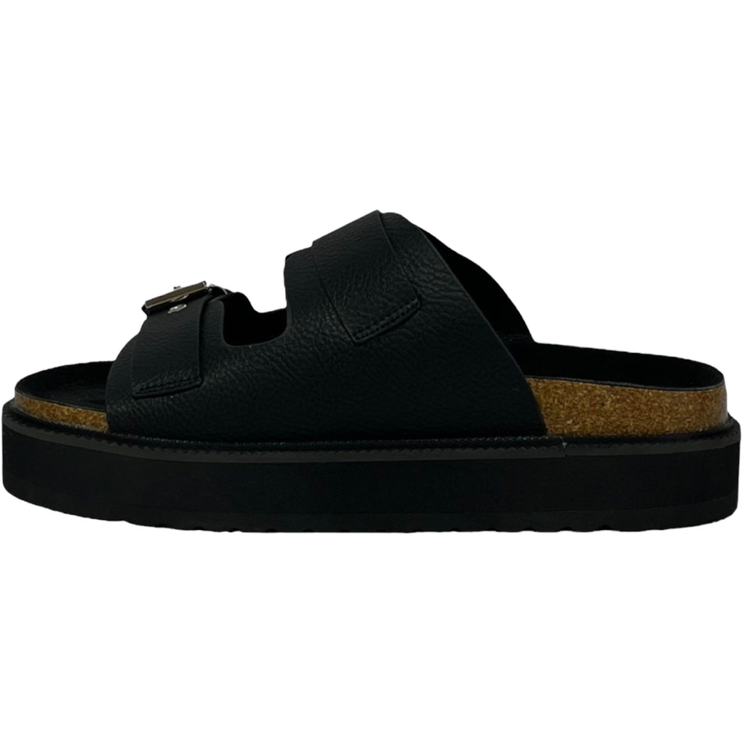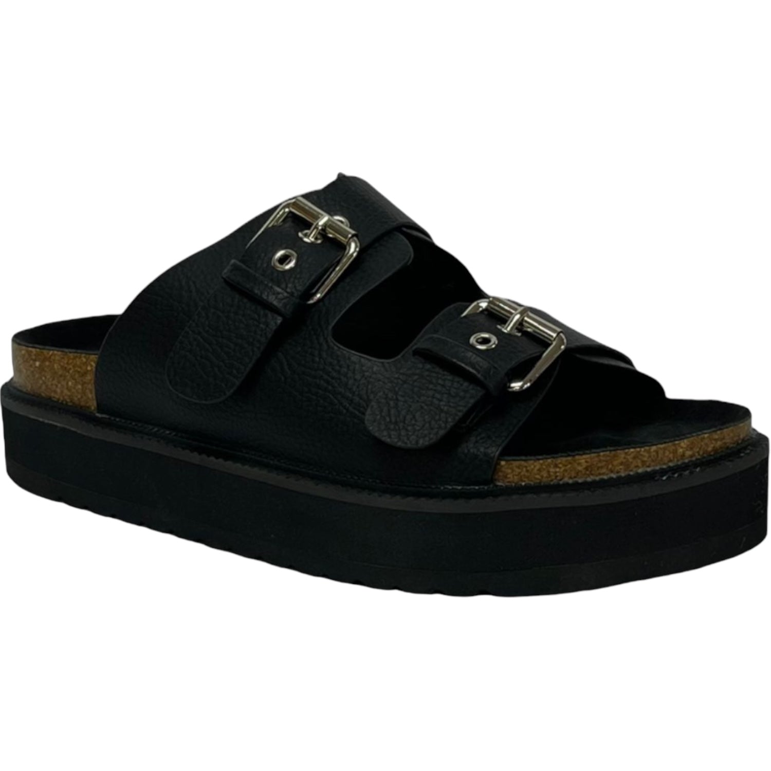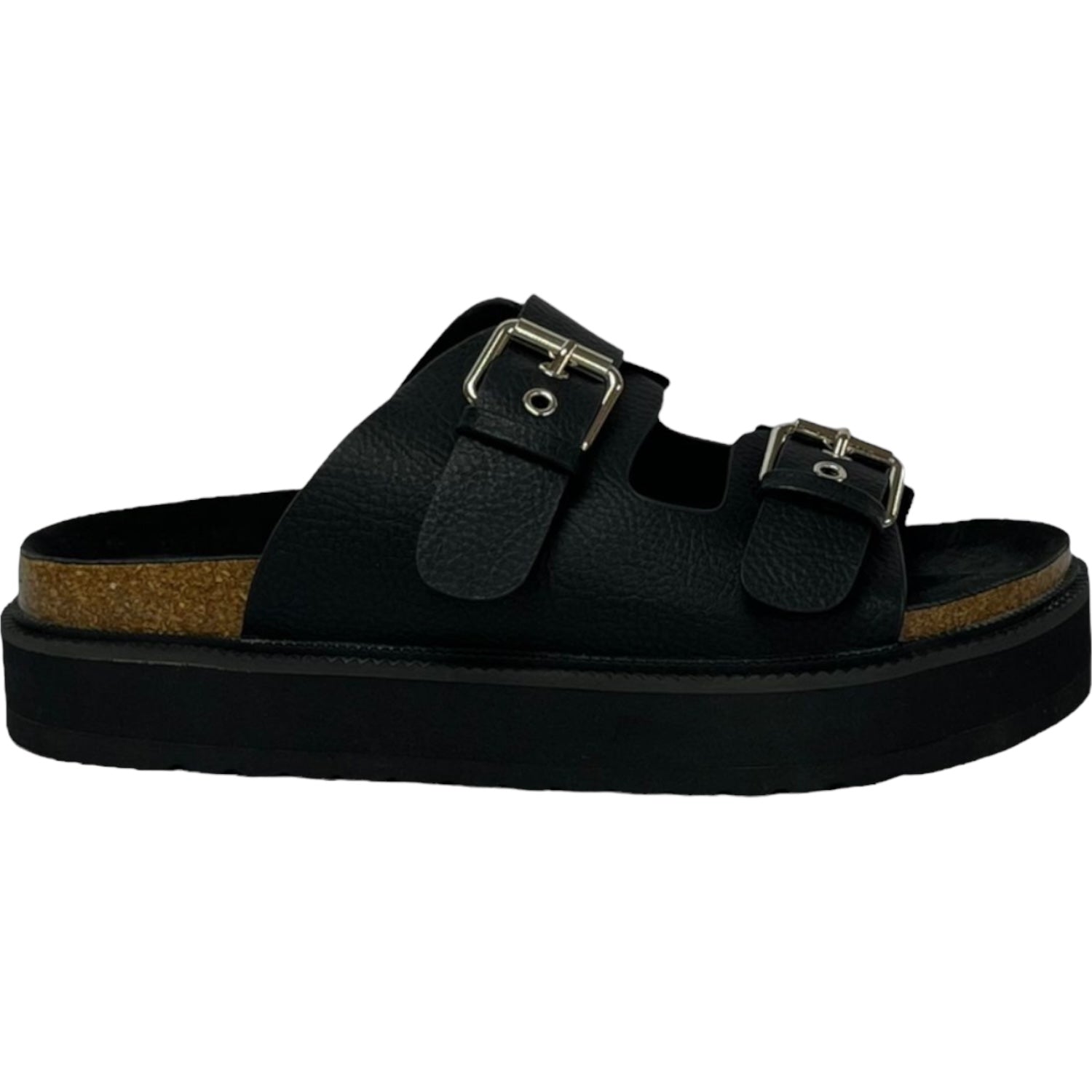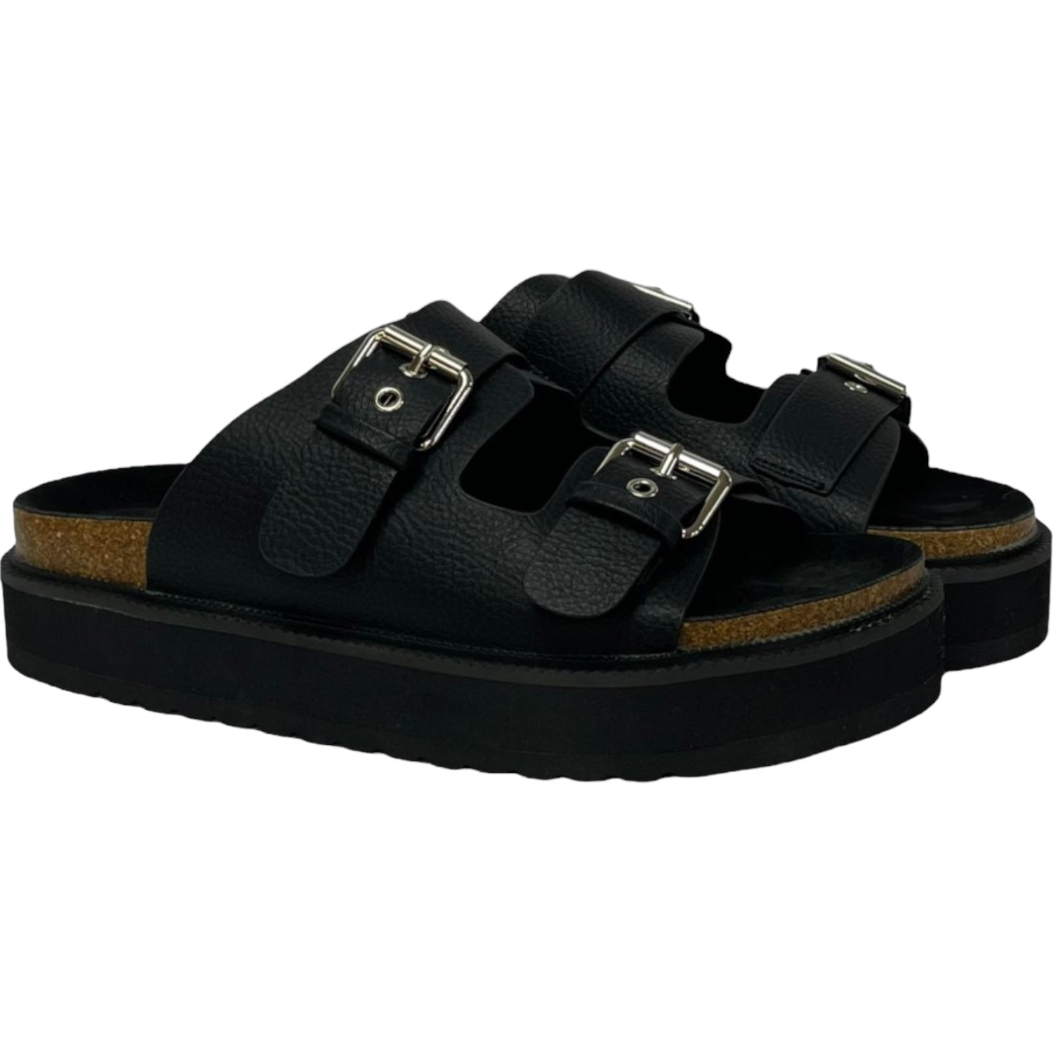 La sandalia cómoda Detogni modelo Tulum en color negro ofrece un estilo clásico y versátil. Con plataforma de 5 cm y plantilla acolchada, asegura confort y estabilidad en cada paso. Su diseño de doble correa ancha con hebillas metálicas ajustables aporta practicidad y un look urbano perfecto para el uso diario.